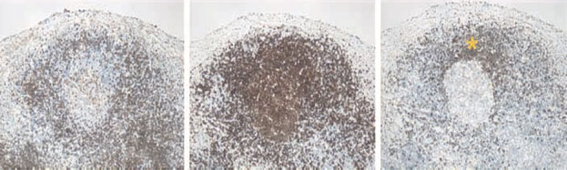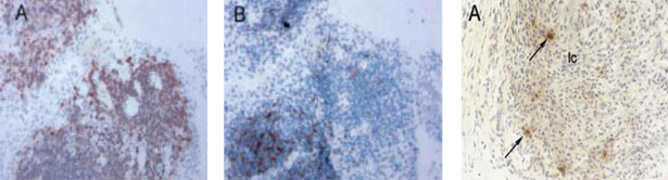 На рис. 5 представлены лимфоплазмоцитарные инфильтраты при ревматоидном синовите, принимающие формы фолликулоподобных структур и иммуногистохимическую идентификацию хемокина CXCL13 в этих структурах в синовиальной оболочке при РА в крайнем справа фото.