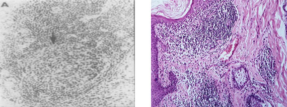 Рис. 7. Слева фолликулоподобная структура с центром размножения (стрелка) в синовиальной оболочке при РА (Х 50), по материалам [173]. Справа фолликулоподобные структуры в дерме и в мышечной ткани при системной красной волчанке, Х100, по материалам [24]