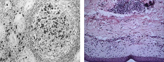 Как указывалось выше, принципиально единообразные патоморфологические изменения при системной прогрессирующей дезорганизации рыхлой волокнистой соединительной ткани свойственны всем нозологическим формам ИВРС. Это же касается и лимфоидного неогенеза. В качестве иллюстрации сказанного приводим рис. 7, где представлены фолликулоподобная структура в синовиальной оболочке при РА слева и фолликулоподобная структура в дерме и в мышечной ткани при СКВ. Видно, что морфологическая организация этих структур при РА и СКВ имеет черты определённого сходства. Важен тот факт, что процент мононуклеаров и нейтрофилов, подвергшихся апоптозу и находящихся в фолликулоподобных структурах при СКВ статистически значимо превышал аналогичные показатели в контрольной группе и коррелировал со степенью тяжести клинического течения СКВ [24].