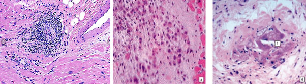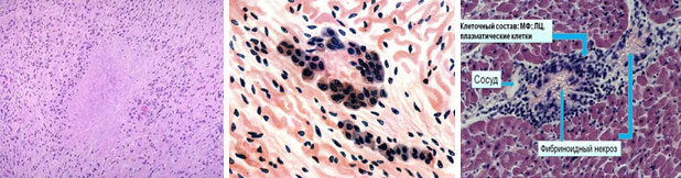 Рис. 10. Слева ревматоидный узелок (Х100). Справа два снимка гранулёмы в миокарде при ревматической лихорадке. В центре гранулём продукты распада основного вещества соединительной ткани, вокруг мононуклеарная инфильтрация (Х200), по материалам [14]
