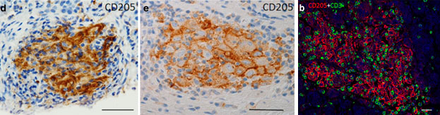 Рис. 12. Иммунные гранулёмы при болезни Крона. Иммуногистохимическая идентификация CD205+ клеток (d,e); CD3+лимфоциты (зелёный цвет) и CD205+макрофаги и дендритные клетки (красный цвет) в иммунной гранулёме, метод иммунофлуоресценции (b), по материалам [114]