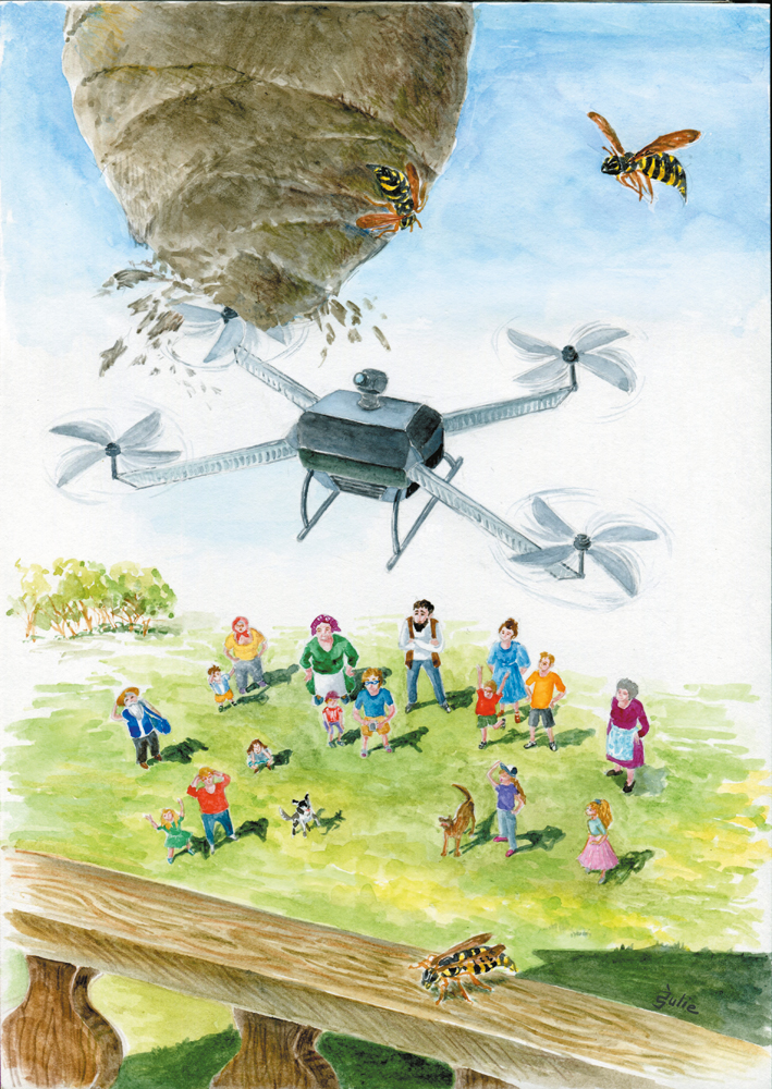 Петя деликатно отстранил болельщиков, запустил дрон и пилотировал его через приложение в телефоне. Четыре наружные лопасти должны были выступить в качестве ножей, чтобы срезать улей. Правда, с первого раза это сделать не получилось. Поначалу Петя боялся приближать своего летающего робота к стене и потолку балкона, опасаясь повреждений, но потом приспособился… Приблизившись к осиному гнезду несколько раз, дрон понемногу расчистил лопастями всё пространство. Даже издали было видно, как возмущённые осы покидают разрушенное жилище. Ещё пять-десять минут – и операция была завершена.