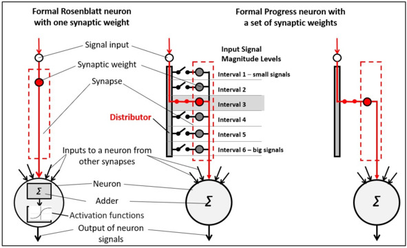 In the Progress neuron, as in the Rosenblatt neuron, input signals travel to the adder through a single synaptic weight. However, in the Progress neuron, the distributor selects the weight based on the input signal size.