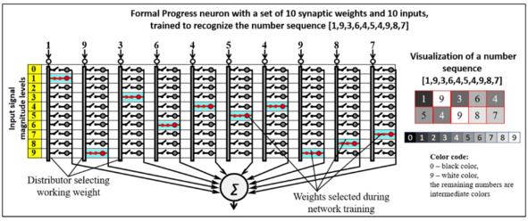 The training of the Progress neuron to a specific image boils down to the distributor determining the signal level (in the simplest case, its amplitude or RGB value) and closing the switch corresponding to the range of weights in which this value falls.