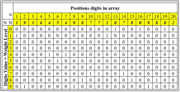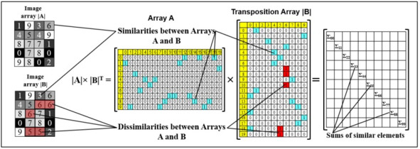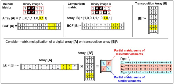 for X ≠ A, f (A) A is a given value. N is the dimension of vector X, the number of digits in this vector. This format, called the Binary Comparison Format (BCF), is a rectangular binary digital matrix in which: • The number of columns is equal to the length N (the number of digits) of the array. • The number of rows equals the number of weight levels K selected for the network. • Each significant digit is denoted by one (1) in the corresponding line, and the absence of a digit is denoted by zero (0). • Each string corresponds to some significant digit of the numeric array to be written, i.e., in a string marked as “zero,” the digit “1” corresponds to the digit “0” in the original array, and in a string marked as “ninth,” the digit “1” corresponds to the digit 9 in the array. • In each column of the matrix, one unit corresponds to the value of this figure, and all other values in this column are equal to 0. • The sum of all units in the array matrix is equal to the length N of the array; for example, for an array of 20 digits, it is 20. • The total number of zeros and ones in the matrix of each array is equal to the product of the length N of this array and the value of the base of the number system used. Example: BCF notation of an array of 20 decimal digits [1, 9, 3, 6, 4, 5, 4, 9, 8, 7, 7, 1, 0, 7, 8, 0, 9, 8, 0,2]. Fig. 6. BCF image as a sparse binary matrix A feature of the PANN network is that the image training of neurons typical of neural networks can be replaced by reformatting files that carry numerical dependencies to the BCF format or simply loading files in this format to the network. Type X arrays in BCF format are denoted as matrices |X|. 2.4.2. Comparing Numeric Arrays Comparing objects or determining similarities and differences Determining the similarity of particular objects by comparing them plays an enormous role in thinking, making it possible to identify analogies and differences between different objects – beings, objects, processes, ideas, etc. In various branches of science, primarily in the Theory of Similarity, dimensionless similarity coefficients or similarity criteria (Similarity Coefficient or CoS) are used, sometimes called the “measure of similarity,” the “measure of association,” and so on. Comparison functions in PANN are implemented through mathematical operations on matrices of numeric arrays. Let’s consider the most straightforward comparison algorithm, which uses the vector product of image neuron matrices. Two arrays are given for comparison in the form of matrices |X1| and |X2|. |X1| × |X2|T is the vector product of the matrix |X1| on a transposed matrix |X2|. Moreover, the value of this product is proportional to the number of units in |X1| and |X2|. |X1| × |X2|T = N only if |X1| = |X2|; |X1| × |X2|T |X1| × |X2|T = 0 if none of the pixels of these matrices match. Consider the relationship: Here, the CoS (Similarity Coefficient) between the numerical vectors X1 and X2 determines the degree of closeness of these vectors and the images described by these vectors. Examples: Fig. 7. Multiplying matrices to compare numerical arrays Fig. 8. Comparison of decimal numerical arrays |A| and |B| Classical neural networks only determine which class a recognizable object is most similar to. At the same time, they cannot specify how similar it is. Because of this, recognition is sometimes unstable – there are well-known examples where a change in a pixel in an image was enough to change its recognition. Thus, recognition in classical networks is highly dependent on random noise. In PANN, the situation is different – the similarity coefficient value very clearly shows how significant the difference between the images is. A similarity difference of one hundredth in the format of 32 × 32 pixels corresponds to a change of about 10 pixels. And this is already enough to distinguish the images from each other confidently. The one-tenth difference indicates a profound difference and high recognition stability – low dependence of recognition on noise. In contrast to classical neural networks, PANN networks allow you to improve the quality of recognition dramatically by: • Statistical processing of recognition by classes and by images. • Combining class-based recognition and image-based recognition. Moreover, combined recognition by classes and images allows us to solve one of the most unpleasant problems that limit the use of neural networks in medicine and many other applications – the problem of transparency and explainability of the network results. We will discuss this in l in the “4.6. Recognition on the PANN Network” section. 2.4.3. Assessment of the validity and accuracy of recognition The validity and accuracy of image recognition by neural networks are essential for their use. The accuracy and reliability of recognition of a classical neural network are determined by testing several dozens, hundreds, or thousands of images and counting the number of correct and incorrect recognitions. This test is very controversial. Due to the opacity of classical networks, recognition is highly dependent on random training features: • Sometimes, training outcomes are poorly reproduced; the same network trained on the same images will recognize better in some cases than worse in others. • There are no ways to assess each image’s accuracy and recognition reliability adequately. • Impact of test image selection. Sometimes, they are selected specifically to ensure the desired result. Recognition by PANN networks is evaluated by the numerical similarity coefficient of the image under consideration: 1. With any set of individual images loaded to the network. 2. With all classes that this network is trained in. At the same time, both classes and individual images are ranked according to the degree of similarity, which allows for an accurate assessment of the magnitude of the differences between all the comp