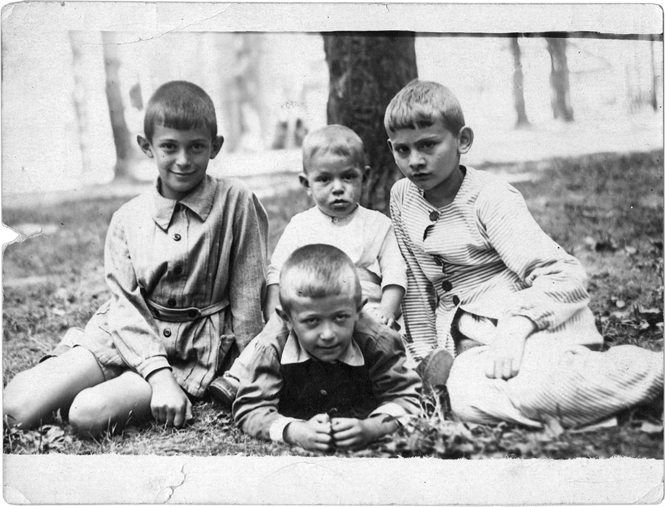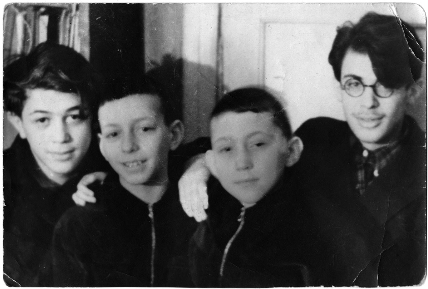 Братья Злотниковы, Юра (крайний слева) и Миша (лежит), с двоюродными братьями Михаилом Рубинштейном (сидит на Мише) и Леонидом Беленьким на даче. 1939