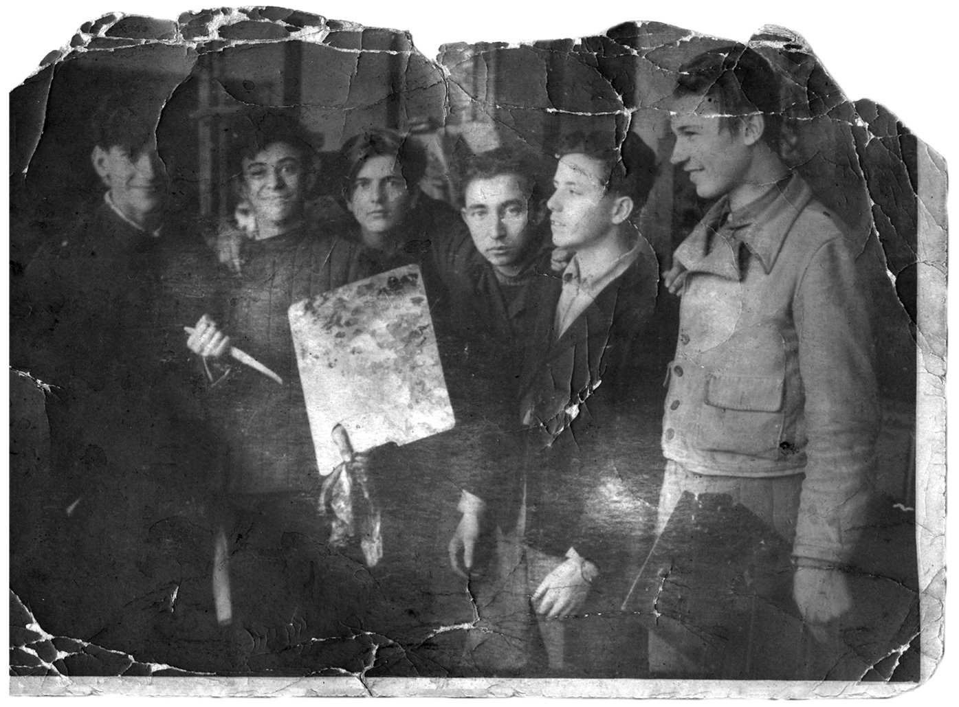 В живописной мастерской МСХШ. Слева направо: Боря Карпов, Юра Злотников, Гриша Дервиз, Э. Вайсман, Гена Михлин, Володя Федорович. Ок. 1945