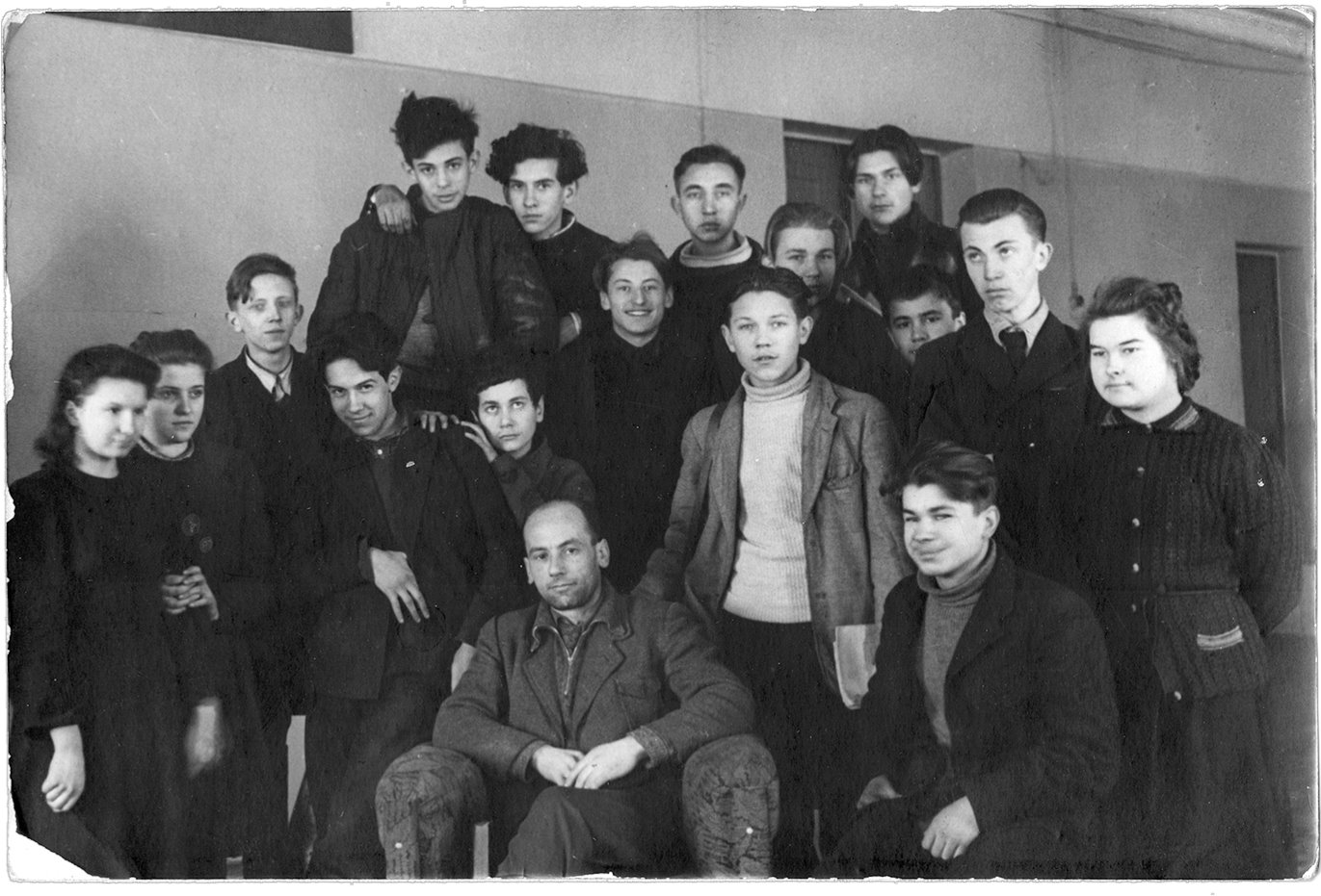 Живописный класс МСХШ педагога Б. Хайкина. Юрий Злотников – слева в верхнем ряду. Справа в нижнем ряду – староста Владимир Андреенков. Ок. 1945