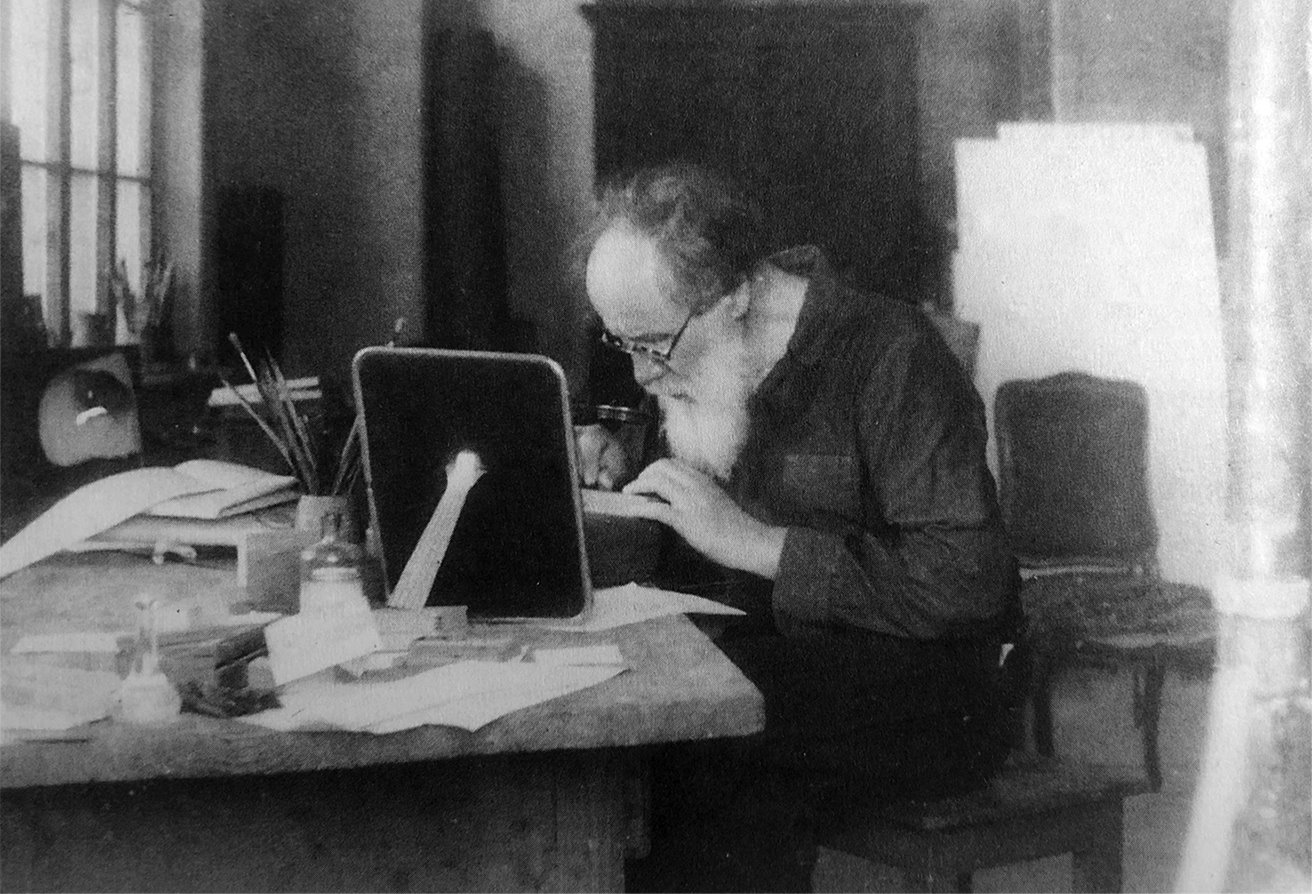 Владимир Андреевич Фаворский в своей мастерской. Новогиреево, 1949