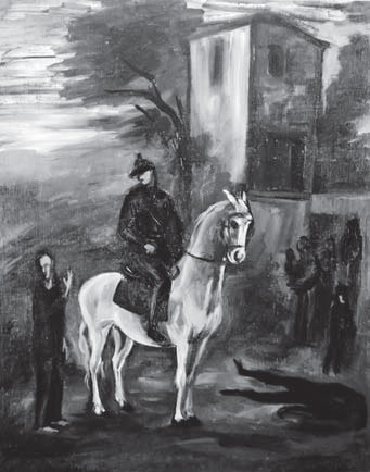 Второй пример – картина неизвестного советского автора «Происшествие» (1937) [илл. 8]. На полотне представлена сцена с всадником, лежащей на земле полутенью/полуфигурой и стоящим рядом человеком. Визуально описываемое здесь событие только что произошло, но время не фиксировано. Внутренний зритель проявляет свое присутствие благодаря реализации в изобразительном рассказе позиции, которая выступает как грамматический аналог формы Present Perfect в английском языке. План выражения (экспрессивный пейзаж, размашистый длинный мазок) особенно оплотнен, и это можно прочесть как актуализацию памяти об авангарде со свойственным этой поэтике акцентом на выражении. Необходимо учитывать и интертекстуальность повествовательного компонента: описываемые события выступают как иконографическая отсылка к мотиву Апокалипсиса (всадник на белом коне, тревожный пейзаж и пр.). В данном повествовании имеет место двойной темпоральный модус: зритель располагается и внутри нарратива (внутренний зритель как свидетель-участник события), и вне его, в той области, которая реализует иконографическую отсылку как интертекст (фоновый дискурсивный прецедент), описывающий время нарратора. Возникает рассказ в рассказе, метанаррация.