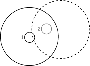 Изначально мы находимся в точке 1, в которой нам кажется, что все объекты и события (точки, составляющие сплошную окружность и равноудаленные от центра 1) имеют одинаковое значение и равный приоритет в нашей жизни. И любое смещение данной точки (например, под влиянием вмешивающихся в нашу жизнь обстоятельств, не оправдавшихся ожиданий и пр.) сразу искажает реальность и меняет наше восприятие (пунктирная окружность при перемещении в точку 2).
