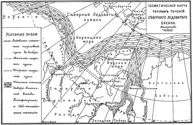 Карта теплых течений, составленная В. А. Русановым к статье «Возможно ли срочное судоходство между Архангельском и Сибирью через Ледовитый океан?»