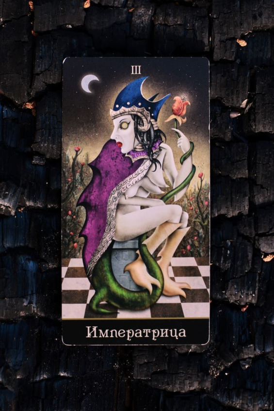 Обычно в большинстве колод Императрица изображается в расслабленной позе, здесь же мы видим ее в некой зажатости и скованности. Тот случай, когда человек не осознает всего своего потенциала и сам сдерживает себя и свои возможности.