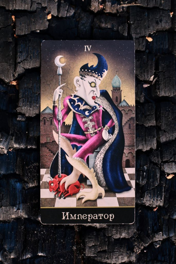 Персонажа, которого мы видим на этом Аркане, невозможно спутать ни с кем другим. Это истинный Император. У него дорогие одежды двух оттенков: насыщенного синего и пурпурного. Подобные оттенки считаются поистине королевскими и в Средние века были под запретом для всех, кроме духовенства, высшей аристократии или коронованных особ. В правой руке он держит посох, которым протыкает быка, при этом прижимая животное к полу ногой. Император настолько велик, что мощный зверь предстает нам размером не больше болонки. Сапоги Императора похожи на лапы дракона – что также говорит о его мощи, свирепости и власти. Мы также видим знакомый нам «шахматный пол» – Император все делит на черное и белое. Причем «белое» – это его мнение, а все не согласные с ним – «черное».