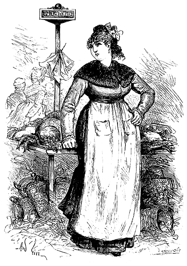 Последнюю надбавку сделала красавица Нормандка. Флоран узнал ее среди торговок, стоявших у железных перил, которые отгораживали место торгов. Утро было свежее. У бюро выстроился ряд женских, подбитых мехом пелеринок, целая выставка белых передников, обтягивавших круглые животы, громадные бюсты и широчайшие плечи. Красавица Нормандка в высоком шиньоне из локонов выделялась и щегольским кружевным бантом, и нежным белым лицом среди лохматых голов, повязанных платками, красных носов любительниц рюмочки, нахально разинутых ртов, напоминавших треснувшие горшки. Луиза тоже узнала двоюродного брата госпожи Кеню и так удивилась, что стала перешептываться с соседками.