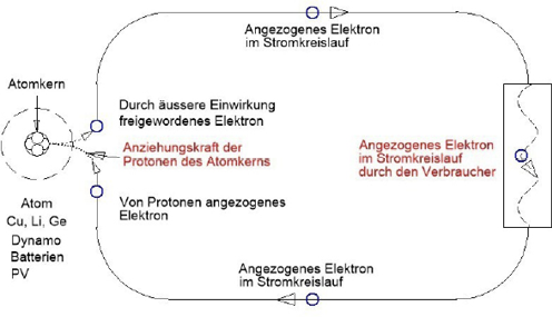 Durch die Einwirkung von elektromagnetischen Feldern werden die äußeren zwei instabilen Valenzelektronen der Kupferatome von dynamischen Generatoren, die mit Protonen der Atomkerne gebunden sind, freigesetzt und fließen dann durch die Anziehungskraft der selben Protonen auf dem Umweg durch einen Verbraucher als umgewandelte Sekundärenergie und fließen wieder zurück, weil der Stromkreis aus stromleitenden Materialien besteht und so den kürzesten Weg ergibt. Die Anziehungskraft der Protonen als Proton-Watt [PW] des Generator-Kupferatoms ist die einzig wirkende Kraft im Stromkreislauf.