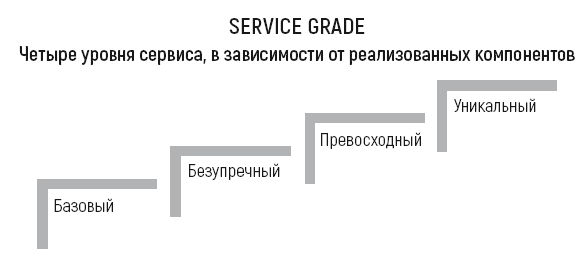 В нашей методике SERVICE GRADE существует 4 уровня сервиса. Уровень определяется реализацией в компании блоков сервиса из предыдущей подглавы 0.3.