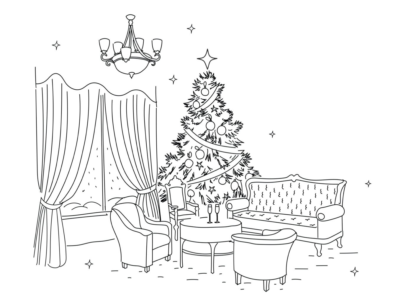 Лишь в гостиной ярко горела украшенная елка, на которой в медленном танце кружились Щелкунчик и его балерина.