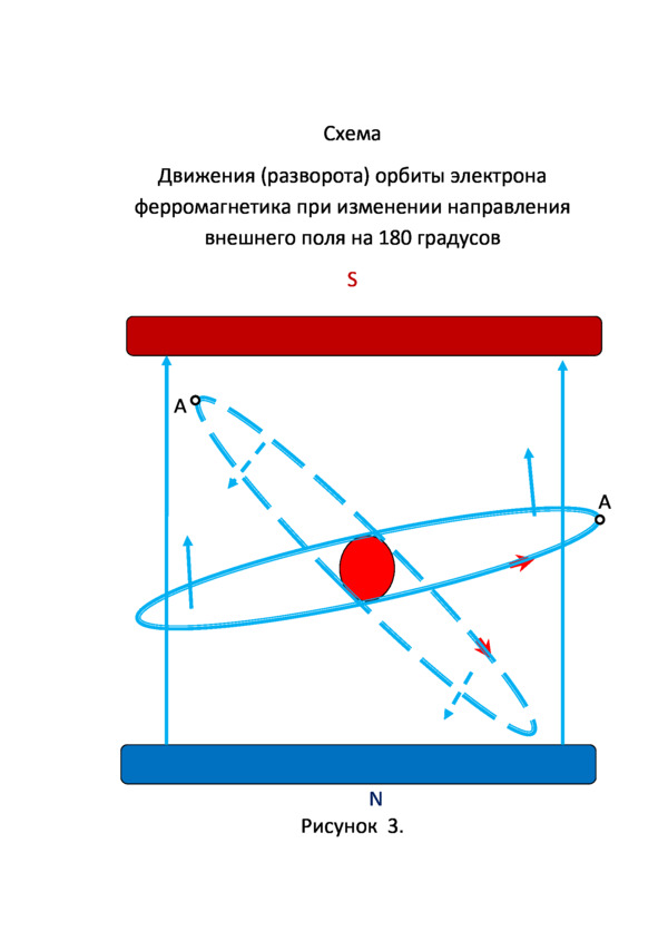 Теперь вектор магнитного поля электрона будет направлен навстречу внешнему магнитному полю. Подчиняясь более сильному магнитному потоку, вектор поля электрона начнет встраиваться в новое направление магнитного потока. Начинается перемагничивание ферромагнетика. В какой-то момент ферромагнетик потеряет внешние магнитные свойства. То есть, он размагнитится. Орбита электрона вернется в прежнее положение. (Изображена пунктиром). При дальнейшем воздействии внешнего магнитного поля, она продолжит разворот до тех пор, пока их вектора станут близкими по направлению и магнитные поля объединятся. Смотри рисунок 3.