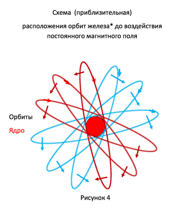 Поместим указанный атом в постоянное магнитное поле. Вектора магнитных полей электронов подчинятся более сильному внешнему магнитному полю. В зависимости от направлений этих векторов, орбиты электронов разобьются на две группы, которые на схеме, для наглядности, имеют разные цвета. Вектора магнитных потоков электронов примут направление близкое к направлению вектора внешнего поля. Магнитные потоки объединятся. Смотри рисунок 5.