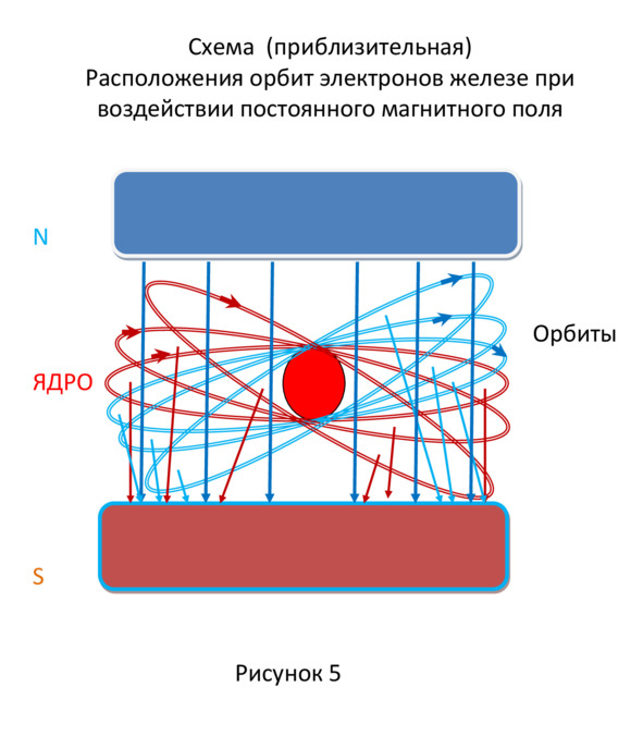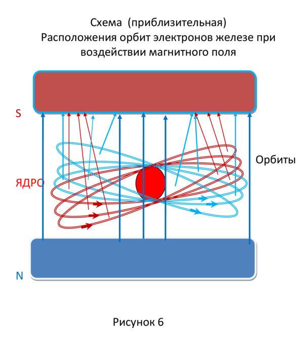 Теперь все магнитные вектора электронов направлены в противоположную сторону, навстречу потоку постоянного магнита. Под действием этого поля орбиты сначала вернутся в положение, показанному на рисунке 4, затем их разворот продолжится до положения указанному на рисунке 6.
