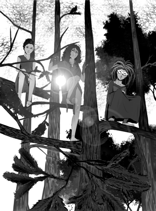 Подойдя к самой кромке леса, один из приятелей останавливается и просит остановиться других, взволнованно смотря куда-то наверх. Прямо над их головами, стоя ногами на крепких ветвях сосны, незнакомые женщины пристально смотрят на вошедших. Лица у них красивые, но очень измученные, волосы растрепаны, их проще состричь под корень, чем расчесать колтуны. На них рваные тёмные лохмотья, на руках и ногах видны следы от недавно снятых тугих кандалов. Кто-то стоит прямо, а некоторые сидят на корточках, но все они смотрят вниз, не шевелясь и не моргая. Порабощённые. Отринувшие цивилизованное общество, не входят свободно в лоно природы – они просто перестают быть защищёнными.