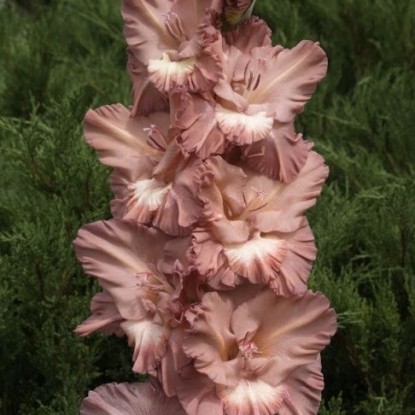 6. Гладиолус гибридный (Gladiolus hybridus hort) – этот вид включает в себя все летнецветущие гибридные сорта. Растения этого вида довольно высокие от 90 до 200 см, имеют различные по величине цветки (от 5 до 20 см). Окраска их очень разнообразна, цветок может объединять несколько оттенков или иметь на лепестках штрихи и пятнышки. Края лепестков могут быть как ровные, так и волнистые или гофрированные. Цветки образуют крупные соцветия (даже более 20 цветков).