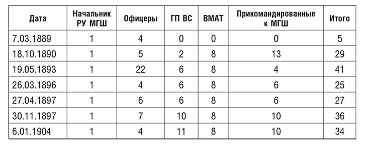 Несмотря на частую смену вывесок, штаты центрального аппарата военно-морской разведки на всём протяжении её существования оставались небольшими. Так, в соответствии с «Положением о Морском штабном управлении» от 7 марта 1889 г., в 3-м (разведывательном) отделе проходили службу 5 офицеров, в том числе 1 капитан 1-го ранга (начальник отдела), 1 капитан 3-го ранга и 3 капитан-лейтенанта. После организации 19 мая 1893 г. самостоятельного Морского Генерального штаба штаты его 2-го бюро увеличились на 1 офицера, ответственного за обработку военно-технической информации, 18 инженер-капитан-лейтенантов и инженер-капитанов 3-го ранга, а также 6 военно-морских редакторов и младших редакторов, находившихся за границей. Кроме того, по императорскому указу от 18 октября 1890 г. к Морскому штабному управлению были прикомандированы 13 офицеров из числа находившихся за границей резидентов. После образования в марте 1896 г. разведывательного отдела МГШ его численность уменьшилась до 5 офицеров центрального аппарата, 6 прикомандированных офицеров, 6 гражданских специалистов, и только в следующем году вновь образованное 3-е (разведывательное) бюро МГШ стало насчитывать 8 штатных, 10 прикомандированных офицеров и 10 гражданских специалистов46. Для взаимодействия с военной разведкой указом императора от 3 октября 1893 г. ко 2-му бюро МГШ был прикомандирован 1 офицер Генштаба47.