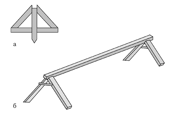 В первом случае каркас состоит из опор, изготовленных в виде треугольника. К бруску длиной 80 см под прямым углом крестообразно прибивают брусок длиной 65 см так, чтобы один конец имел длину 45 см, а другой – 20 см. Между концами крестовины прибивают стропильца таким образом, чтобы в верхней части образовался паз. Нижнюю часть свободного конца заостряют, как у кола (рис. 3 а). Такие опоры устанавливают на гряды или при выращивании на ровной поверхности на посевные ленты через 3 м друг от друга, а в пазы укладывают рейки, образующие коньковый брус. После установки каркасов их покрывают пленкой.