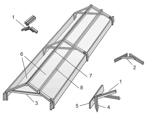 Рис. 4. Укрытие разборно-приставное: 1 – стропильный брус; 2 – накладка; 3 – стяжка; 4 – колышек; 5 – бортовая доска; 6 – пленочное покрытие; 7 – коньковый брус; 8 – бобина.