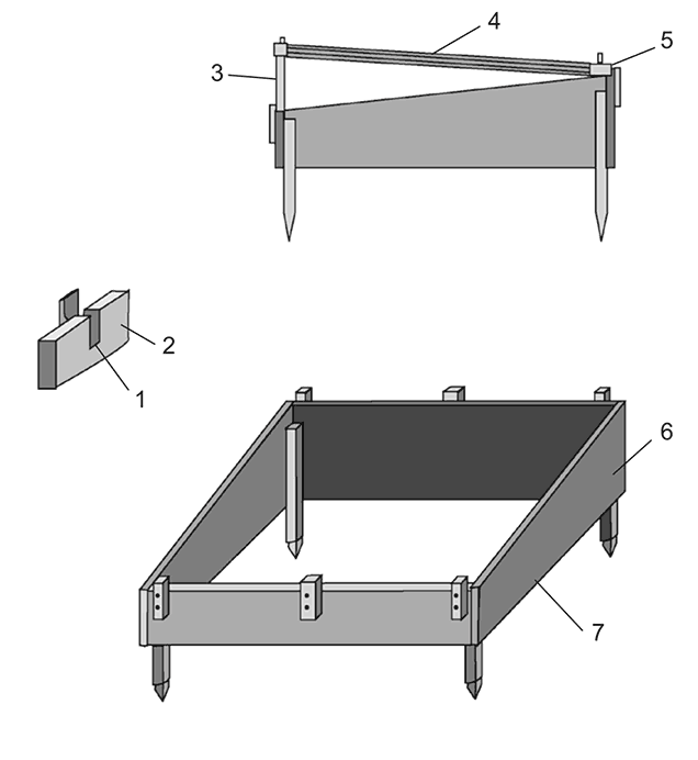 Рис. 5. Проект постройки парника: 1 – стальная полоска 30 × 2 мм; 2 – бетон; 3 – деревянная подставка; 4 – рама; 5 – поперечные планки как упор или шарниры для рам; 6 – нижний край заглубить в землю; 7 – боковую стенку подогнать по ширине к передней и задней стенкам.