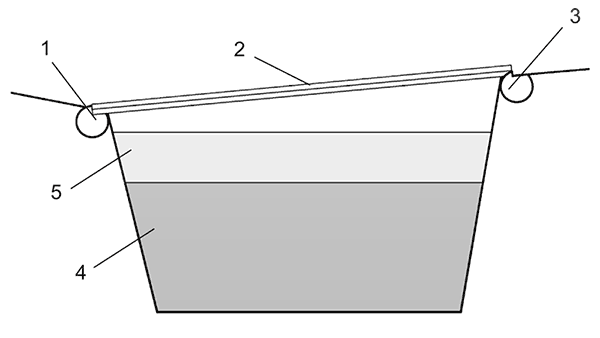 Рис. 6. Русский парник на биологическом обогреве: 1 – южный парубень; 2 – парниковая рама; 3 – северный парубень; 4 – биотопливо; 5 – питательный грунт.