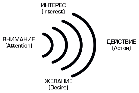 Хорошо формулировать цели помогает модель потребительского поведения AIDA, на которую ориентируются в маркетинге и продажах. Когда клиент знакомится с продуктом или услугой, сначала возникает внимание (Attention), потом интерес (Interest), затем желание (Desire) и, наконец, действие (Action).