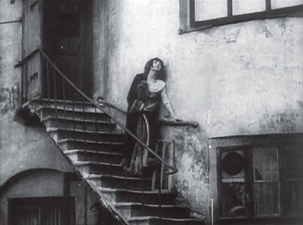 Вера, нагруженная корзинами для бедных, поднимается по лестнице многоэтажного доходного дома. Первое режиссерское открытие – деталь на крупном плане: две пары женских ног на ступеньках, снятые снаружи через квадратное окно между этажами, образ перехода из одного мира в другой.