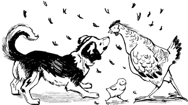 Собака от удивления даже рот раскрыла. И цыплёнка выпустила. И тот сразу поскорей убежал. А собака посмотрела, кто её клюнул в глаз. И, увидя куру, рассердилась и бросилась на неё. Но тут подбежал хозяин, схватил собаку за ошейник и увёл её с собой.