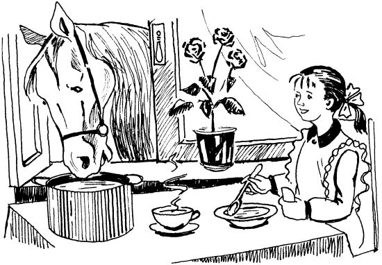 Лошадь кушает такую полезную еду, которую дети кушают.