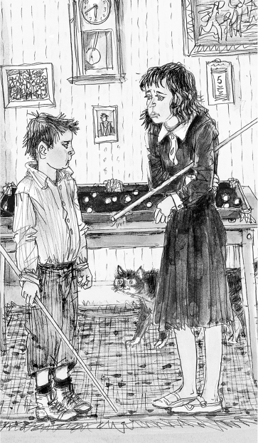 Папа, который ещё не ушёл, чрезвычайно нахмурился. Он подошёл к бильярдному столику и пересчитал оставшиеся шары. И их оказалось пятнадцать, а шестнадцатый шарик лежал под кроватью.