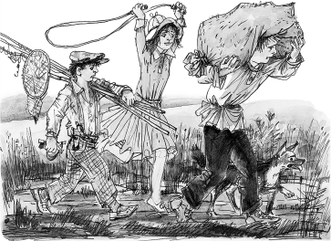 Впереди бежала Стёпкина собачка Тузик. За ней шёл Стёпка с громадным мешком на голове. За Стёпкой шла Лёля со скакалкой. И за Лёлей с тремя рогатками, сачком и удочкой шёл я.