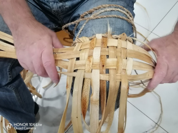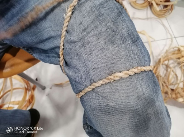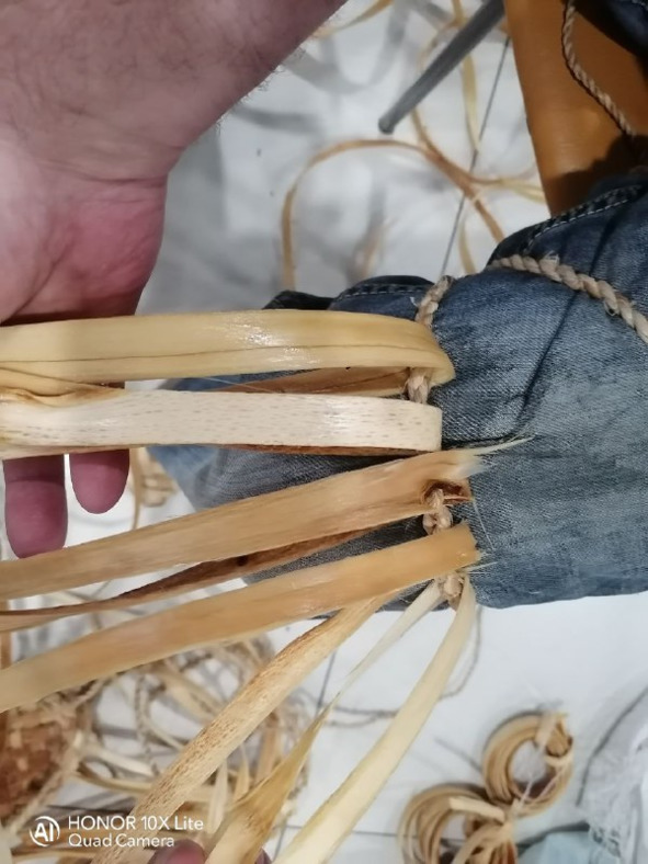 Закрепляем веревку на коленке. Секрет татарского лаптя заключается в том, что лычка должна быть 2500. Мы берем лыковые лычки, заготовленные осенью или зимой, потому что летом у нас полевые работы. Веревочку можно сплести из мочала из лыка, которое осталось от циновки лычек. Широкие лычки мы пускаем на плетение лаптя, а мочало на плетение веревочки. Перед началом плетения нам нужно размочить лычки и свить веревочку из мочала. Веревку сильно не затягивайте, а то кровь не будет поступать и ногу придется отнять.