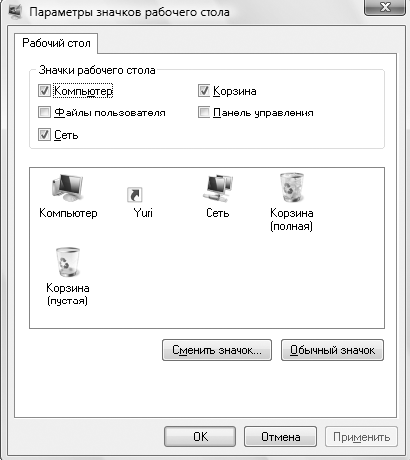 Вы можете открыть окно настройки значков Рабочего стола, щелкнув кнопкой мыши в окне Персонализация на ссылке Изменить значки рабочего стола, которая находится на левой панели окна. В появившемся окне (рис. 2.26) можно включать или отключать отображение на Рабочем столе значков Компьютер, Файлы пользователя, Сеть, Корзина и Панель управления.
