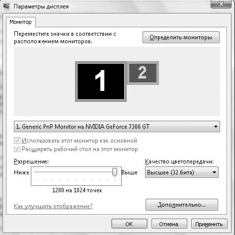 Для изменения экранного разрешения и качества цветопередачи вы найдете соответствующие элементы управления в окне Параметры дисплея (см. рис. 2.27). А чтобы изменить частоту обновления экрана, нажмите кнопку Дополнительно и перейдите на вкладку Монитор, где в раскрывающемся списке выберите нужное значение частоты обновления.