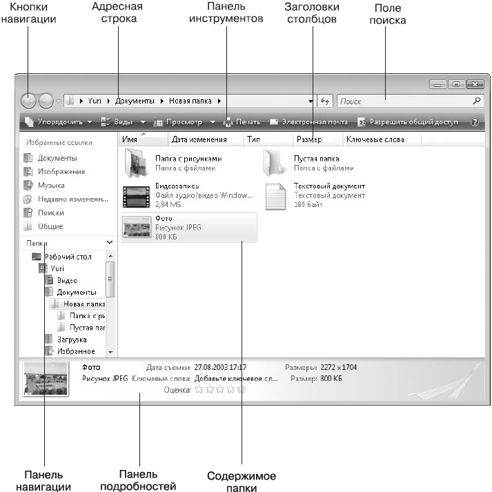 В окне Проводника Windows Vista можно выделить следующие основные элементы.