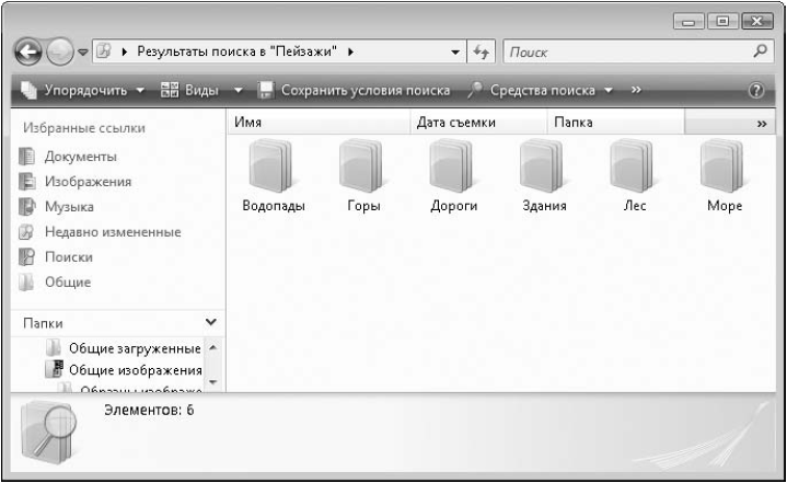 □ При выборе разложения по стопкам Проводник создает виртуальную папку Результаты поиска; для возврата к просмотру папки в обычном режиме используйте кнопку Назад или снова выберите папку на панели навигации.
