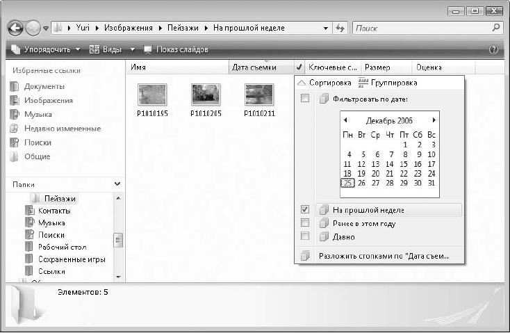 В режиме фильтрации вы можете выбрать для просмотра только одну или несколько групп файлов, которые отвечают определенным условиям. Для этого щелкните кнопкой мыши на стрелке справа от нужного заголовка и установите флажки возле названий интересующих вас групп (см. рис. 2.37). После этого щелкните кнопкой мыши в области содержимого папки или нажмите клавишу Enter.