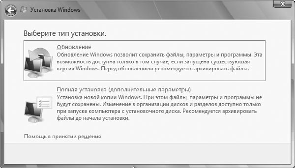 6. Следующий этап – выбор между новой установкой и обновлением (см. рис. 2.6). Для инсталляции Windows 7 на другой раздел выберите вариант Полная установка.