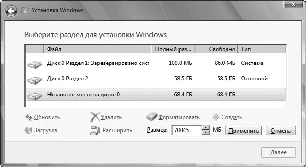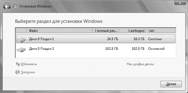 8. Далее вы увидите список имеющихся разделов жесткого диска (рис. 2.7), один из которых вам придется выбрать для установки Windows 7. Это очень важный этап, особенности которого были рассмотрены выше. Щелкните кнопкой мыши на нужном разделе, а затем нажмите кнопку Далее для продолжения установки.