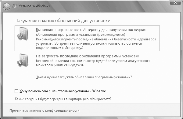 4. В первом диалоговом окне вам будет предложено подключиться к веб-узлу компании Microsoft и загрузить имеющиеся обновления для установки (рис. 2.10). Используйте этот вариант, если ваш компьютер имеет скоростное подключение к Интернету. В противном случае данный шаг можно пропустить, выбрав ссылку Не загружать последние обновления программы установки.