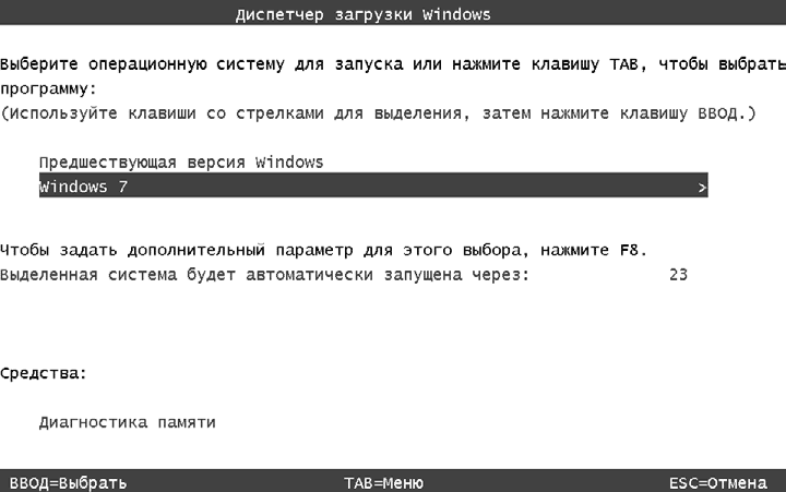 После установки Windows 7 при каждой загрузке компьютера будет появляться экран выбора операционной системы (рис. 2.11). Для выбора варианта загрузки используйте клавиши управления курсором, а для подтверждения – Enter. Если не нажимать никаких клавиш, то через несколько секунд будет запущена операционная система по умолчанию, которой является Windows 7.