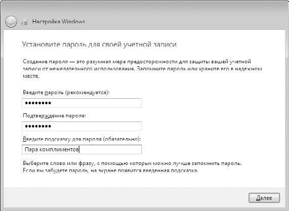 2. Ввести пароль своей учетной записи. Для этого придется заполнить все три поля: сначала ввести пароль, затем повторить его и, наконец, ввести подсказку для пароля (рис. 2.13). Можно, конечно, отказаться от пароля, оставив все поля пустыми. В этом случае вход в систему будет выполняться автоматически и компьютер будет доступен всем желающим.