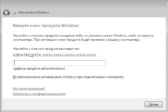 3. Ввести серийный номер или ключ продукта (рис. 2.14), который является подтверждением легальности вашей копии Windows 7. Здесь же можно запретить автоматическую активацию Windows, сняв имеющийся флажок. Это рекомендуется сделать, чтобы иметь возможность протестировать систему после установки, но вам все же придется выполнить активацию вручную в течение 30 дней.